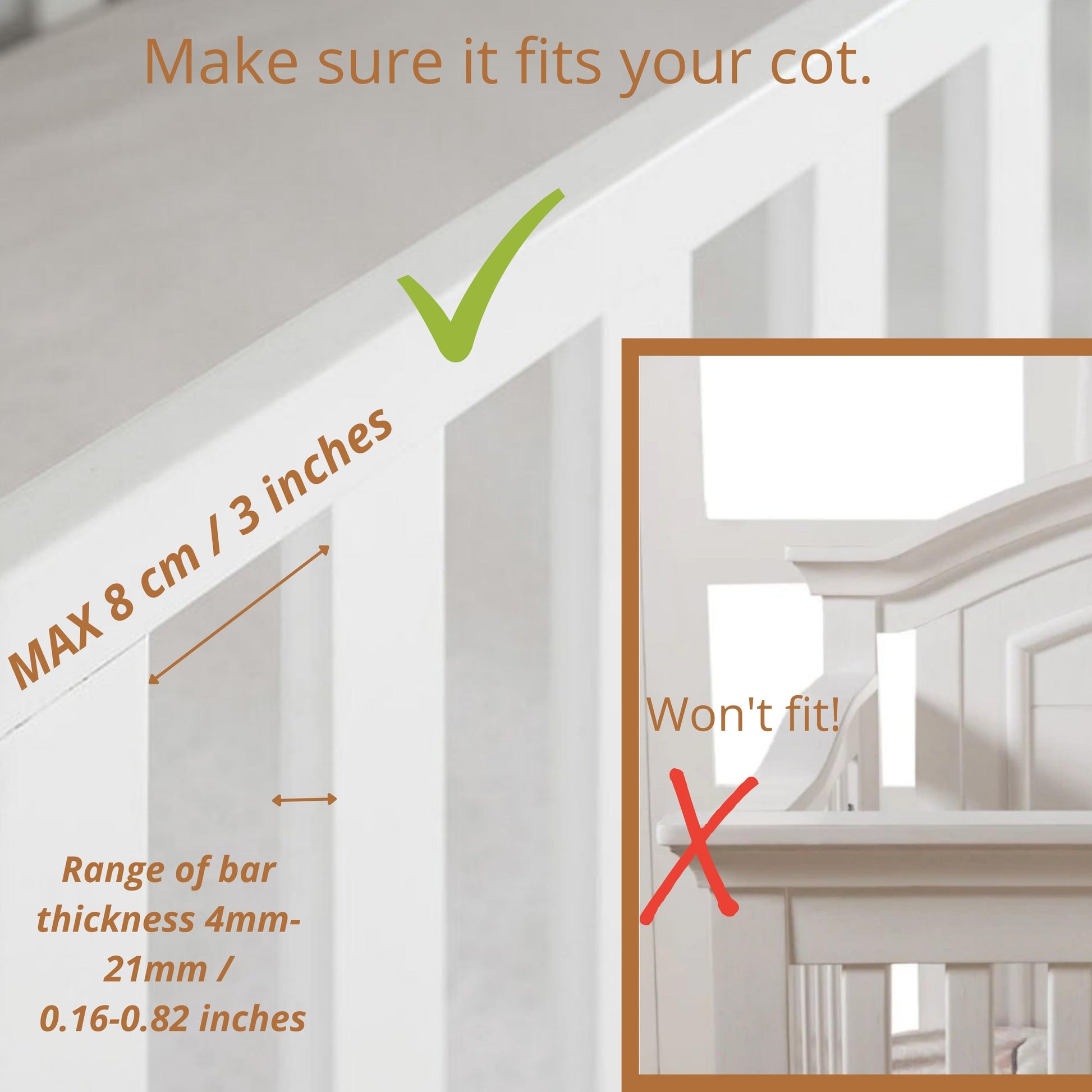 Designed for effortless installation, the wooden arm swivels at the base for easy positioning. The sturdy clamp consists of two parts that screw together securely around crib railings up to 0.82 inches (21 mm) wide, ensuring a firm and reliable hold.